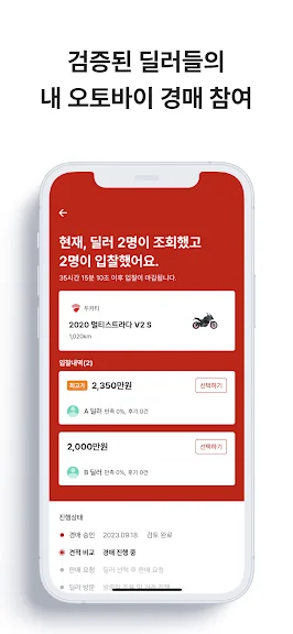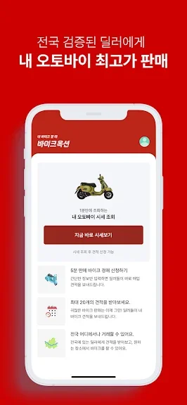 : 전국 제휴 딜러들이 경매를 통해 고객님의 오토바이를 구입합니다. 가장 높은 가격을 제안한 딜러에게 내 오토바이를 판매해보세요! 당연히, 판매 없이 견적만 받아보셔도 좋습니다!