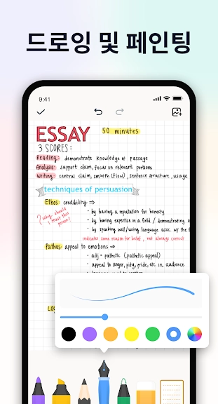 ■ 펜 색상, 굵기, 스타일(만년필, 볼펜, 브러시 펜, 형광펜)을 마음대로 변경하여 노트를 예쁘게 꾸며보세요.