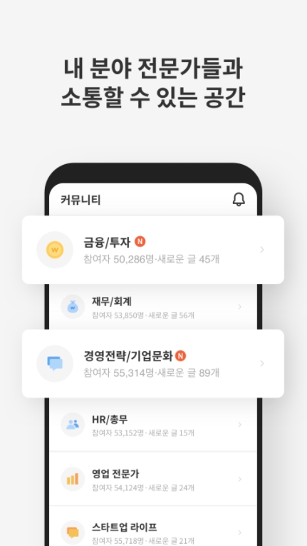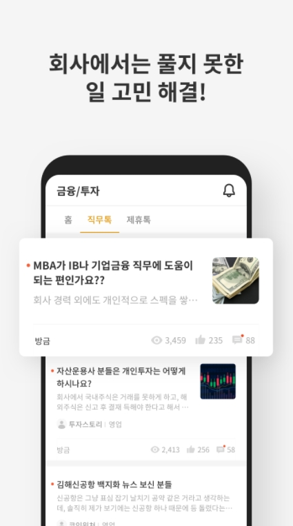- 업계 이슈 토론, 커리어 고민 상담 등의 직장인 토크