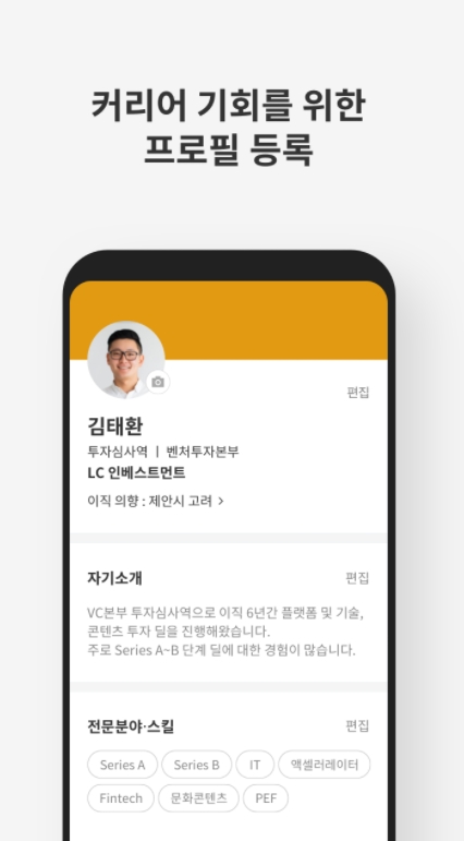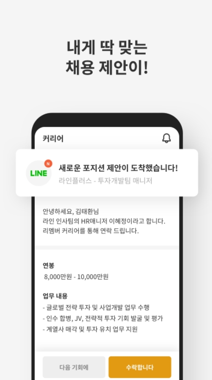 - 간단한 프로필 등록으로 기업 채용담당자 및 헤드헌터로부터 채용 제안 수신
