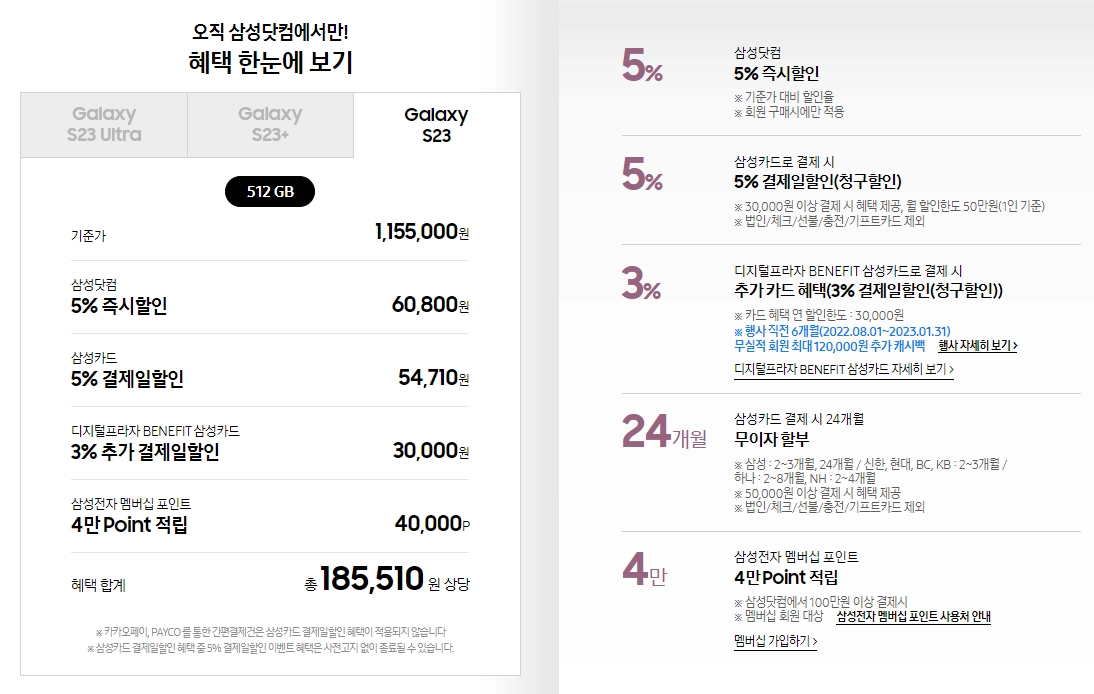 Galaxy S23 512GB 인데도 1,155,400원 으로 준다고 하네요~ 사전구매에 관심있으신분들은 서두르세요.